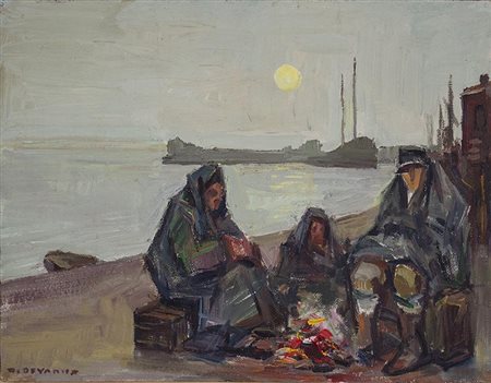 Lot 14 Domenico De Vanna, Olio su compensato, 30x40cm, Il guardiano del piccolo porto, 1974; Firmato in basso a sinistra, sul retro etichetta Prof De Vanna