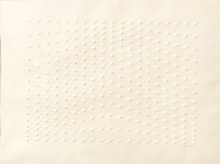 Lot 17 Enrico Castellani,Calcografia a secco, 45x60cm, Superficie bianca, 1969; 100 esemplari + 10 prove e 7 prove con lettere A/G impressione a secco per la cartella "Grafica '69" con opere di Baj, Bruni, Turcato, Ceroli, Guereschi, Morlotti, Pozzati, Sironi, Stefanoni. L'opera è una prova d'artista