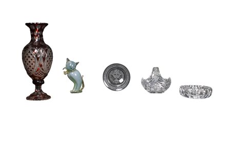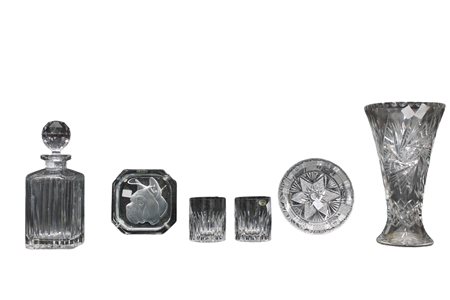 Lot 260 LOTTO DI 6 OGGETTI in vetro di cui: un posacenere Cristal Sevres, 2 bicchieri in vetro di Boemia, 1 bottiglia, 1 vaso e 1 posacenere XX secolo misure varie