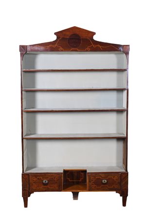 Lot 255 CURIOSA LIBRERIA A GIORNO in noce a cinque ripiani e due cassetti nella parte inferiore, intarsiata in bosso e varie essenze di legno Sicilia XVIII secolo h cm 180 x 106 x 21