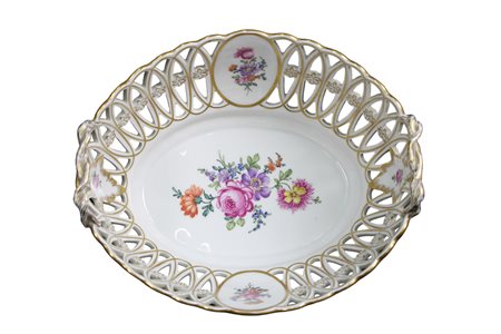 Lot 256 ALZATA in porcellana traforata dipinta e decorata a motivi floreali e dorature marcata Dresden Germania XX secolo h cm 14,5 x 27 x 23