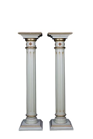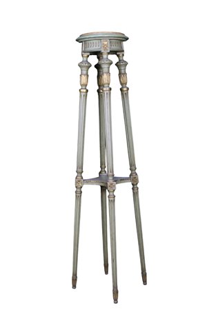 Lot 264 COPPIA DI TRESPOLI A COLONNA in legno laccato verde e dorato, arricchiti da piccole applicazioni in metallo dorato Sicilia primi 900 h cm 104 x 26 x 24
