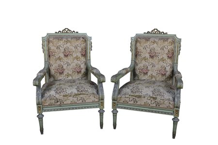 Lot 267 COPPIA POLTRONE in legno laccato verde e dorato, tappezzate con stoffa decorata a motivi floreali, usure del tempo Sicilia primi 900 h cm 103 x 67 x 64