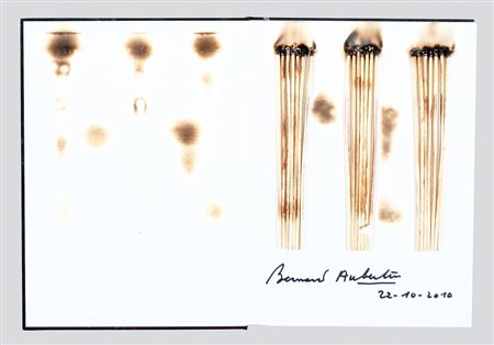 Lot 4 BERNARD AUBERTIN Fontenay aux Roses 1934 Senza titolo, 2010 applicazioni di fiammiferi e combustioni su libro "Bernard Aubertin, il fuoco e il rosso", edizioni Galleria Rosenberg cm. 31x45, firma e anno in basso a destra, dichiarazione d'autenticità dell'artista su foto, entro teca in plexiglass.