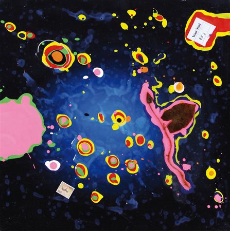Lot 16a PABLO ECHAURREN Roma 22/01/1951 Caduchi colori, 1994 acrilici su tela cm. 50x50, titolo, firma e anno al retro, dichiarazione d'autenticità dell'artista su foto.