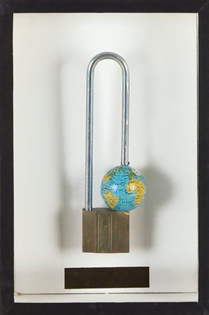 Lot 10 CHRISTIAN TOBAS Puz 1944 Projet pour le monde n° 3, 1973 applicazioni di lucchetto e mappamondo in scatola/cornice cm. 30x20x7, titolo, firma, anno ed etichetta dello Studio Marconi (MI) al retro.