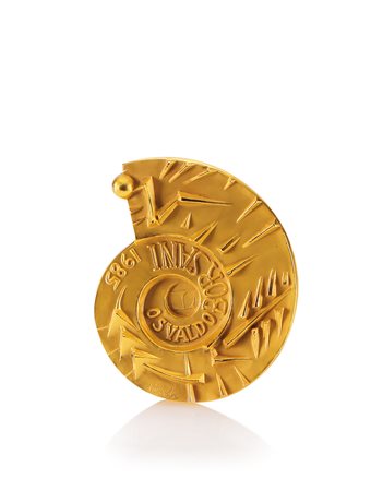 Lot 13 ARNALDO POMODORO Morciano di Romagna 1926 Senza titolo scultura in bronzo dorato cm. 8x6,5x1; opera multipla non numerata realizzata dalla Tecno (MI) in ricordo dell'amico Osvaldo Borsani, firma sul fronte, certificato della Tecno allegato.
