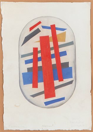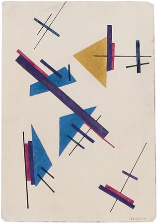 Lot 18 IVAN VASSILIÈVITCH KLIOUNE Bolchie Gorki 1873 - Mosca 1943 Senza titolo, (1918-1920) tempera su carta cm. 21x15, firma in cirillico in basso a destra, dichiarazione d'autenticità e provenienza del Sig. Mario Fissore (Antiquariato Il Cancello di Novara) su foto,