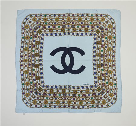 Lot 3 CHANEL Foulard azzurro fantasia. Seta. Cm 85,00 x 85,00. Foulard in seta Chanel vintage, orli profilati a mano, colore di base azzurro, logo Chanel con le caratteristiche CC intrecciate al centro, logo Chanel in basso, decorato da una fantasia a stampa gioiello nei toni del gialllo oro, blu, verde, bianco e viola. Etichetta tessile 100% seta presente.