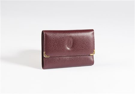 Lot 7 CARTIER Portafoglio bordeaux. Pelle. Cm 15,00 x 10,00. Portafoglio Cartier vintage in pelle bordeaux martellata, dettagli dorati hardware agli angoli della patta a chiusura con bottone a pressione, logo Cartier impresso al fronte. All'interno, una tasca aperta per le banconote, una tasca con aperture porta carte, un borsellino per le monete con chiusura a scatto in hardware dorato, logo Cartier in caratteri dorati all'interno.