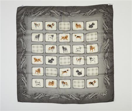 Lot 10 BURBERRY Foulard con stampa di cani. Seta. Cm 86,00 x 86,00. Foulard in seta Burberry, fondo grigio, fantasia di cani, check e motivo di collari e guinzagli ai bordi.
