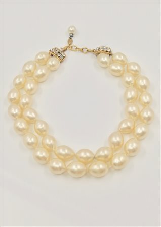 Lot 11 CHANEL Collana di perle. 1989. Perle. Cm 39,50. Collana a due fili di perle ovoidali di grandi dimensioni. Fermaglio in metallo dorato con cristalli bianchi. Estensione finale con perla e distanziale di cristalli bianchi. Collezione 23. Fine anni '80 - inizi '90. Design di Victoire de Castellane. Lunghezza cm 35,5 co estensione di cm 4, totale cm 39,5. Nuone condizioni, piccolissimi difetti in alcune perle.