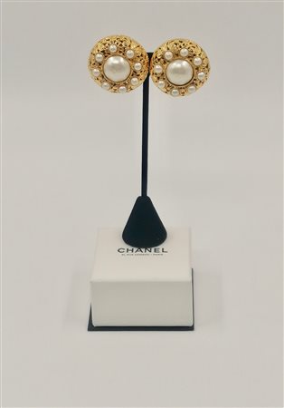 Lot 12 CHANEL Orecchini in filigrana e perle. 1980. Filigrana e perle.. Cm 4,00. Grandi orecchini a lobo bombati con clips. Lavorazione a filigrana, perle sul fronte, Collezione anni '80. Design di Victoire de Castellane. Diametro cm 4. Condizioni eccellenti.