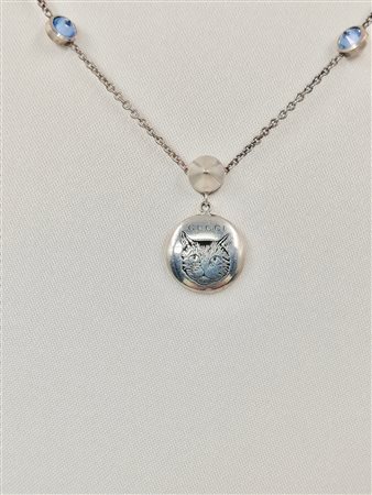 Lot 13 GUCCI Collana BLIND FOR LOVE. 2017. Argento 925.. Cm 40,00. Sottile catena in argento intercalata da coni in cristallo azzurro, in omaggio alla collezione " Diamonds in the Yards" realizzata alla fine degli anni '70 da Elsa Peretti per Tiffany. Al centro piccolo medaglione pendente. Presenta su un lato "testa di gatto", sull'altro è incisa la frase "BLIND FOR LOVE" (cieco d'amore). Collezione 2017 di Alessandro Michele. Punzone Ag 925. Lunghezza cm 40, medaglione diametro cm 1,3. Condizioni eccellenti pari a nuovo con box originale.
