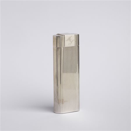 Lot 14 CARTIER Accendino in metallo argentato. Metallo argentato.. Cm 2,50 x 7,00 x 1,50. Accendino in metallo argentato con iniziali AG. Logo Cartier Paris al fondo.