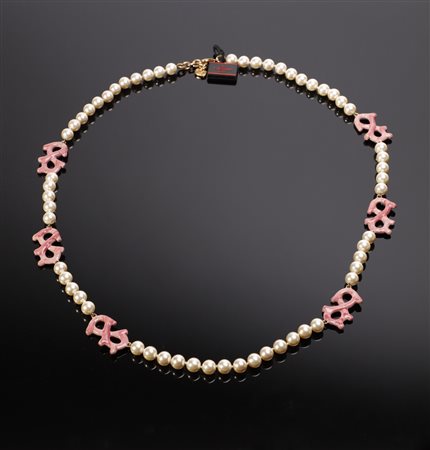 Lot 15 GARAVANI VALENTINO Filo lungo di perle artificiali e smalti. . Plastica dura. Cm 2,00 x 92,00. Lungo filo di perle artificiali Valentino vintage con inserti smaltati a forma di fiocco color rosa.