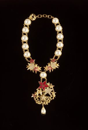 Lot 16 DE LIGUORO GIANNI Collana con perle sintetiche, smalti e strass. Plastica dura. Cm 8,00 x 36,00. Collana con perle sintetiche, decorazioni di stelle a smalto color cordeaux e strass.