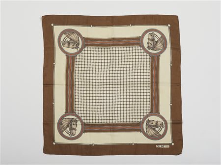 Lot 18 CELINE Foulard stampato nei toni del marrone. Seta. . Foulard Celine stampato a motivi geometrici ed equestri nei toni del marrone su fondo beige, Celine Paris firmato in un angolo in basso.