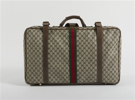 Lot 19 GUCCI Valigia in canvas monogram. Canvas. Cm 40,00 x 65,00 x 15,00. Valigia Gucci vintage in canvas monogram Guccissima, dettagli in pelle marrone a contrasto, dettaglio nastro web rosso e verde, dettagli in hardware dorati, due cinghie esterne, interni in tessuto gillo oro, una tasca interna a zip, cinghie porta abiti interne.