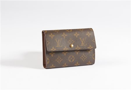 Lot 21 VUITTON LOUIS Portafoglio in canvas monogram. Canvas. Cm 16,00 x 11,00. Portafoglio vintage Louis Vuitton, in canvas monogram, chiusura con bottone a pressione in hardware dorato. Logo Louis Vuitton/Parigi/Made in France in rilievo all'interno della patta. All'interno, una tasca aperta per banconote, una tasca con aperture porta carte, un portamonete con chiusura a scatto.