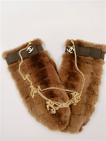 Lot 23 CHANEL Muffole in pelliccia. 2001. Vizelle.. . Muffole / Guanti matelassé chocolat bar in pelliccia miele, nastri in gros grain ton su ton, lunga catena in metallo dorato. Collezione Autunno 2001. Taglia M. Made in Belgium. Composizione: Vizelle (cincillà) 100%. Fodera: 75% viscosa, 25% seta. Ottime condizioni.