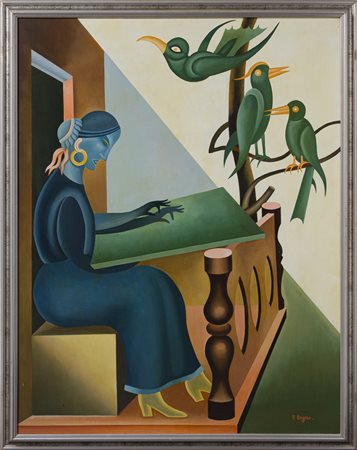 Lot 5 DEPERO FORTUNATO (1892 - 1960) ROSETTA CHE CUCE, 1919/1954. Olio su compensato. Cm 76,50 x 100,00. firma