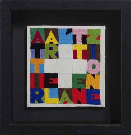 Lot 17 BOETTI ALIGHIERO (1940 - 1994) ATTIRARE L'ATTENZIONE. 1988. ricamo su tessuto. Cm 21,50 x 23,00 x 1,00. sul retro: firma