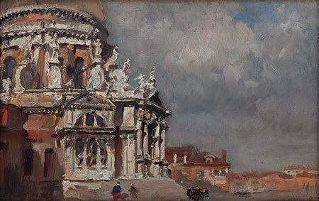 Lot 21 Emanuele Brugnoli Bologna 1859 - Venezia 1944 Santa Maria della Salute a Venezia Olio su cartone cm 18x29 Emanuele Brugnoli, nato a Bologna il 2 settembre 1859, fu uno stimato pittore italiano noto soprattutto per le sue straordinarie opere realizzate con la tecnica dell'acquerello. Dopo aver studiato all'Accademia della sua città sotto la guida dello scenografo Valentino Solmi, divenne l'allievo prediletto di quest'ultimo. La sua carriera artistica fu fortemente influenzata dalla sua permanenza a Venezia, iniziata nel 1880 dopo aver trascorso alcune settimane nella città della laguna. A Venezia, Brugnoli entrò in contatto con artisti del calibro di Tito, Serena, Favretto e Milesi, e si dedicò principalmente alla rappresentazione di vedute e paesaggi lagunari. La sua abilità straordinaria nell'uso dell'acquerello divenne evidente, definendo gran parte della sua produzione artistica. Nel 1861, si recò a Londra per partecipare all'Esposizione degli acquerellisti italiani, e da allora partecipò a numerose mostre internazionali. Nel 1886, prese parte alla Promotrice fiorentina, seguita nel 1888 dalla partecipazione all'Esposizione Emiliana di Bologna. La sua presenza alla Biennale di Venezia fu notevole, partecipando alla seconda edizione nel 1899 e a quelle successive dal 1901 al 1907 e dal 1920 al 1934. Nel 1912, Brugnoli ottenne il titolo di professore di acquerello e incisione presso l’Accademia di Belle Arti di Venezia, dirigendo la Scuola Libera di Incisione fino al 1932. Nonostante la sua fama fosse principalmente legata agli acquerelli, dimostrò grande passione anche per l'acquaforte, prendendo ispirazione soprattutto da James McNeill Whistler. La sua notorietà crebbe ulteriormente grazie all'acquisto da parte dell'Imperatore di Germania Guglielmo II di uno dei suoi acquerelli, "Un canale di Venezia". Brugnoli continuò a esporre regolarmente alle Internazionali veneziane, guadagnandosi l'attenzione critica per la sua maestria artistica. Emanuele Brugnoli si spense a Venezia il 22 marzo 1944, lasciando un lascito duraturo nel mondo dell'arte, soprattutto per la sua abilità distintiva nell'uso dell'acquerello e dell'acquaforte.
