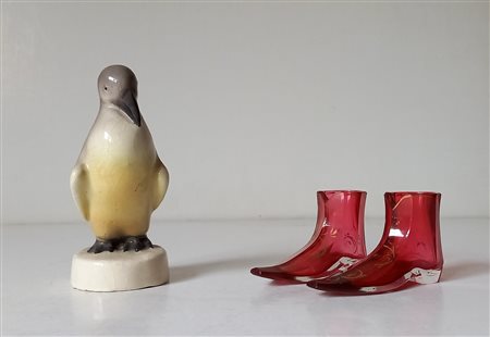Lot 2 PINGUINO IN CERAMICA POLICROMA E SCARPETTE IN VETRO ROSSO DECORATE IN ORO H.MAX.CM.11,5