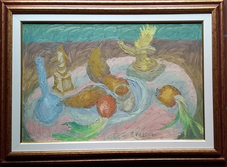 Lot 22 ENZO VESCOVI (1929) - NATURA MORTA - OLIO SU TELA CM.40X60 FIRMATO IN BASSO E AL RETRO