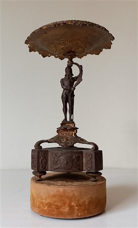 Lot 23 ALZATA CON ARMIGERO IN METALLO SBALZATO BRUNITO E DORATO SU BASE VELLUTATA H.TOT.CM.28