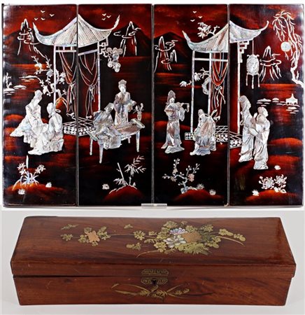 Lotto composto da uno screen a quattro pannelli in legno laccato e intarsiato in madreperla con scene di vita (cm 40x59,5). Unito a un cofanetto in legno intarsiato in madreperla a motivi floreali (l cm 40)