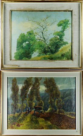 Lot 204 Lotto composto da due "Scorci boschivi" di diversi autori del secolo XX, dipinti ad olio su diversi supporti, di diverse misure, firmati in basso a destra