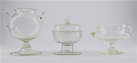 Lot 206 Lotto composto da tre vasetti in vetro incolore, uno con coperchio decorato a foglie e volute. Secolo XIX/XX (h. max cm 13)
