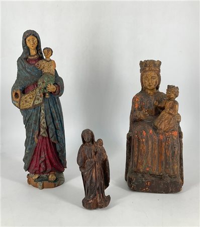 Lot 209 Arte del secolo XIX-XX. Lotto composto da tre diverse sculture lignee in parte policrome raffiguranti la Vergine col Bambino, un crocefisso in osso e un crocefisso in bosso scolpiti (h max cm 36) (difetti e mancanze)