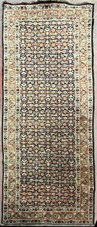 Lot 211 Tappeto galleria romeno, secolo XX. Decoro Herati su fondo marrone scuro con bordura Herati su fondo rosso (cm 462x150) (difetti)