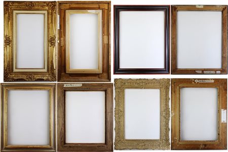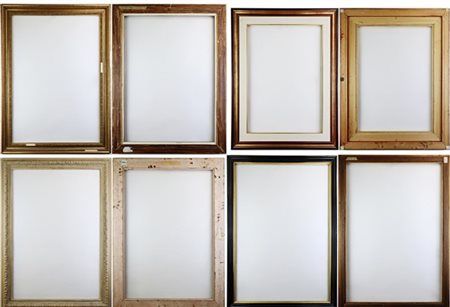 Lot 212 Lotto di sette diverse cornici in legno e altri materiali. Alcune dorate. (cm max 112x81,5) (difetti). Luce di ogni cornice iscritta al retro
