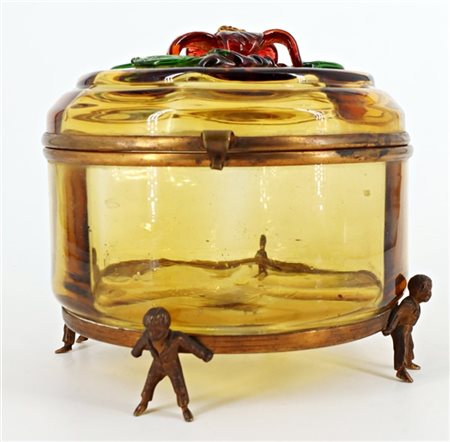 Lot 215 Scatola porta biscotti in vetro con coperchio ambrato decorato da ramo fiorito, base in metallo sorretta da figure di fanciulli. Traccia di Etichetta cartacea "Romana Confiseur...Turin" (d 20x17) (difetti)