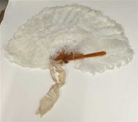 Lot 219 Ventaglio con stecche in bachelite color ambra e piume di struzzo bianche, nastro in raso rosa pallido, cofanetto originale S. Labriola & figli - Piazza Carlo Felice 6, Torino (lievi difetti, segni d'uso)