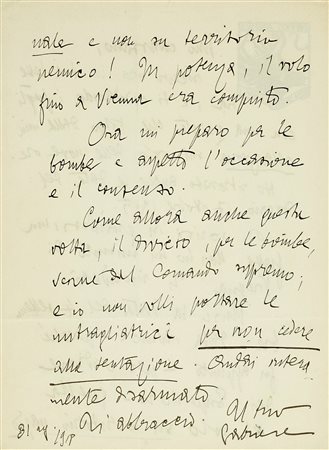 Manoscritto a inchiostro nero. 1 carta scritta al recto. Carta con filigrana, intestata Sufficit animo / Prima Squadriglia Navale. Busta autografa conservata, con timbri Espresso, Verificato per censura, Prima Squadriglia Navale S.A., Spedisce il Comandante / La 1 Squadriglia Navale S.A. cui fa seguito la firma autografa di d'Annunzio. Dimensioni: 270x200 mm. (1)Lettera spedita da Venezia e inviata a Roma, Via due Macelli 66: Mio carissimo, ricevo ora la tua lettera, e ti rimando i fogli con una giunta che tolgo dalla mia relazione sul volo delle nove ore. Ho ritrovato anche la data del diario: 17 ottobre 1915. [...] Non ho un minuto di tregua. Ti riscriverò. Misi la data del 4 settembre – data iconica – perché fu appunto – per ordine dei Superiori – quella del volo sul territorio nazionale e non su territorio nemico! In potenza, il volo fino a Vienna era compiuto. Ora mi preparo per le bombe e aspetto l'occasione e il consenso. Come allora anche questa volta, il divieto, per le bombe, venne dal Comando Supremo; e io non volli portare mitragliatrici per non cedere alla tentazione. Andai interamente disarmato [...]. -