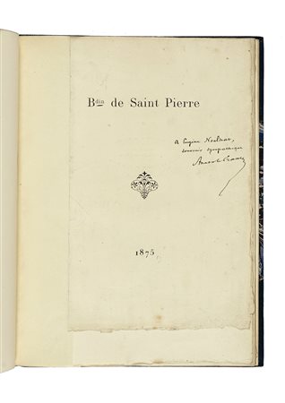 Dedica al frontespizio e annotazioni a inchiostro nero. Testo a stampa (8 pagine) seguito dalle annotazioni di France (numerate da mano moderna 2-17). Testo estratto da l' Amateur d'autographes. Le pagine del testo a stampa sono state tagliate e applicate su supporto cartaceo e poi legate insieme agli appunti di France e alcuni ritagli di giornale. Alcuni appunti sono datati secondo il calendario della Rivoluzione Francese. Da studiare. Ottime condizioni. Legatura in mezzo marocchino blu con angoli. Dimensioni: 260x185 mm. (1)Il volumetto inizia con le pagine della pubblicazione di Anatole France: B.din de Saint Pierre et la Princesse Marie Miesnik (1875). Dedica all'occhiello: A Eugène Noalbat, / souvenir sympathique / Anatole France. Seguono una serie di appunti che Anatole France definisce frammenti inediti della corrispondenza di Jacques-Henri Bernardin de Saint-Pierre, autore del romanzo Paul et Virginie, di cui alcuni scritti alla moglie. Uno è relativo alla nomina di Saint-Pierre a membro della Legion d'honneur (1806) su richiesta diretta dell'imperatore (Napoleone). Je réunis ici quelques fragments inédits de la correspondance de Bernardin. Ce sont des citations et des analyses recueillies par M. Jacques Charavay en vue du Manuel de l'amateur d'authographes : publication continuée mais non encore achevée par M. Etienne Charavay fils – M. Etienne Charavay, archiviste-paleographe, m'a ouvert ses cartons avec une bonne grâce parfaite. J'en ai tiré une lettre inédite de Bernardin de Saint Pierre à M. Deschamps, peintre. La voici. Bien que l'objet de cette lettre soit peu important, on y trouvera plus d'un trait de caractère. Il y a dans les habitudes d'esprit de Bernardin une affectation naïve qui le fait se montrer tout dans deux mots. Solitude et providence. C'est tout l'homme. [...]. Il y a dans les habitudes d'esprit de Bernardin une affectation naïve qui le fait se montrer tout dans deux mots. Solitude et providence. C'est tout l'homme. [...] n'admire tu pas la Providence, qui m'envoye bienfaits, grâces, faveurs, et du propre mouvement de l'empereur. Le cœur des grands rois est dans les mains [...]. Jacques-Henri Bernardin de Saint-Pierre (Le Havre, 19 gennaio 1737 – Éragny, 21 gennaio 1814) è stato uno scrittore e botanico francese. Ispirato a Robinson Crusoe, di Daniel Defoe, nel 1787 scrisse il romanzo Paul et Virginie, ambientato all'Île de France, l'odierna Mauritius. Jean-Baptiste Descamps (Dunkerque, 28 agosto 1714 – 30 giugno 1791) è stato uno scrittore e pittore francese di scene campestri. Marin Étienne Charavay, nato il 17 aprile 1848 a Parigi e morto il 3 ottobre 1899 a Brolles, è stato uno storico, editore e libraio francese. Proveniente da una famiglia di librai specializzati nel commercio di autografi e nella perizia di documenti antichi, subentrò nel 1867, dopo la morte del padre Jacques Charavay, alla gestione dell'azienda di famiglia con l'aiuto dello zio Gabriel Charavay e della scrittrice Julie Lavergne. Durante l'affare Dreyfus, fu uno degli esperti ascoltati durante il processo Esterházy: Archivista ed esperto molto famoso, sembra che Charavay sia stato oggetto di manipolazione. Persone che si presentarono come parenti di Dreyfus gli avrebbero fatto una falsa proposta di corruzione, cosa che avrebbe orientato il suo giudizio nella direzione opposta alla verità. -