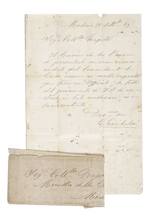Manoscritto a inchiostro nero. Una pagina scritta. Conservata busta con indicazione autografa: Sig. Coll.llo Grapolli Ministro della Guerra Modena. Dimensioni: 145 x 210 mm. (1)Il Giovine che ho l'onore di presentarle mi fu raccomandato dal Comandante lo Guido, siccome di molta capacità, per farne un Ufficiale; se fosse del piacimento di V.S. di accetarlo in tale condizione, io ne sarei contento. Dev.mo suo G. Garibaldi. Nel settembre 1859 Garibaldi si trovava a Modena per preparare un'azione militare verso le Marche papali, con il fattivo sostegno, anche economico, di Mazzini. -