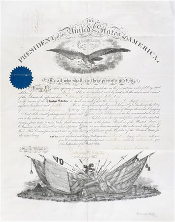 Documento pergamenaceo con testo manoscritto e a stampa. Foglio con intestazione The / President of the United States of America / to all who shall see these presents greetings [...]. Incisa l'aquila, le bandiere e corredi militari. Con sigillo in carta azzurra al margine superiore sinistro. Firmato dal Presidente degli Stati Uniti d'America. A inchiostro rosso (un po' sbiadito, al margine superiore sinistro) la registrazione del documento "Recorded Vol. 17 p. 112" con firma di Edward Davis Townsend. Dimensioni: 500x395. (1) - -