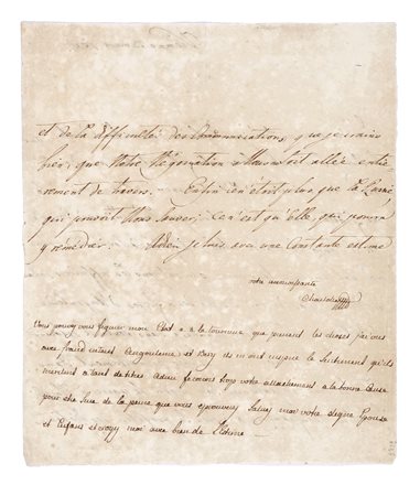 Manoscritto a inchiostro bruno. Testo in francese di mano di segretario; firma e nota finale di sette righe (sempre in francese) autografe. 1 carta, scritta recto e verso. Filigrana coronata. Conservata cartelletta intestata Librairie ancienne Georges Privat - Paris con applicato ritaglio di scheda in francese relativa al documento e nota di acquisto a penna marzo '69. Dimensioni: 190x225 mm. (1)Maria Carolina, regina di Napoli, figlia di Maria Teresa d'Austria e sorella di Maria Antonietta (regina consorte di Luigi XVI, ghigliottinata durante la Rivoluzione Francese) scrive ad un amico conte, raccontandogli delle sue preoccupazioni per Napoli, e delle sue negoziazioni con la Russia (dello Zar Paolo I), perché intermediasse nelle vicende belliche tra la Francia di Napoleone e il regno di Napoli. J'ai vu avec très grand plaisir, mon cher Comte, que le Roi a bien voulu placer votre fils, et lui accorder le grade de Capitain de l'Etat major de l'armée [...] La malhereuse tournure qu'ont pris les affaires, m'a mis dans le cas de voir ici les deux frères d'Angoulême et de Berri [...] Je suis actuellement dans la plus vive impatience sur ce qui se passe à Naples. L'astuce des Français a si bien su profiter des distances et de la difficulté des communications que je crains que notre négotiation à nous ne soit allée entièrement de travers. Enfin ce n'était plus que la Russie, qui pouvait nous sauver ; ce n'est qu'Elle, qui pourra y remédier [...] votre reconnaissante Charlotte M(arie). -