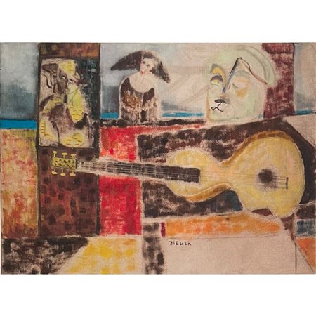 Lot 3 Bruno Zieger, Chitarra con maschere, tecnica mista su tavola, cm 50x70