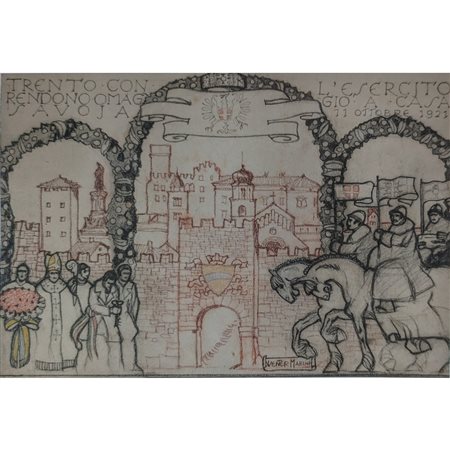 Lot 17 G. Wenter Marini, Trento con l'esercito rendono omaggio a Casa Savoia 11 Ottobre 1921, bozzetto per cartolina commemorativa, carboncino e sanguigna su carta, cm 43x62. Pubblicato sul volume "Giorgio Wenter Marini - Pittura, Architettura, Grafica", 1991, a cura di Maurizio Scudiero