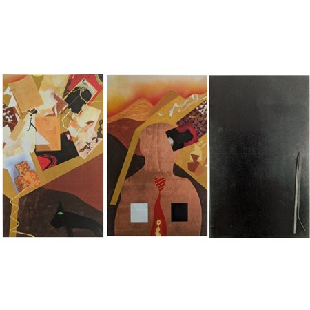 Lot 22 Bruno Zieger, Trittico La Biblioteca abitata (1992), nr. 3 pannelli - tecnica mista su legno, cm 130x80 cad.