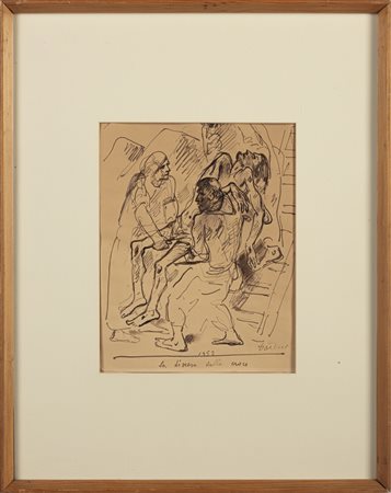 Lot 14 CARENA FELICE (1879 - 1966) LA DISCESA DELLA CROCE, 1952. 1952. Inchiostro e acquarello bruno su carta. Cm 22,00 x 28,00. titolo, firma e data. Cornice presente