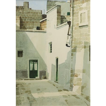 Lot 16 Aldo Riso - Specchia, 1975 H cm Olio su cartone Firmato in basso a destra. Al retro timbro della Galleria La Tavolozza di Fiuggi
