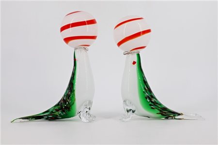 Coppia di sculture in vetro soffiato raffiguranti foche. Seconda metà secolo XX. (h cm 21) (lievi difetti) -
